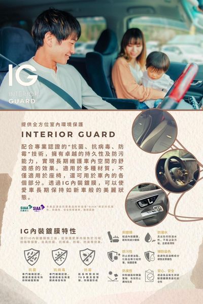日本製的「INTERIOR GUARD」內裝鍍膜,擁有卓越的持久性及防污能力,且配合專業認證的“抗菌、抗病毒、防霉”技術,實現長期維護車內空間的舒適感的效果,為室內環境提供全方位保護。